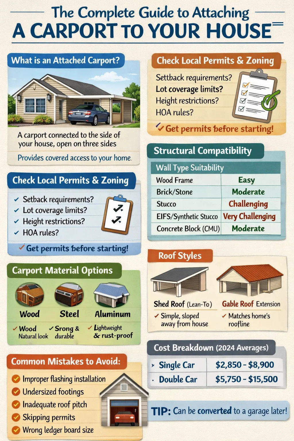 Yes, you can attach a carport to your house — and in most cases, it's a practical, cost-effective alternative to building a full garage. An attached carport typically costs between $3,000 and $10,000, compared to $20,000–$50,000 for a new attached garage. However, whether you should attach a carport to your house depends on your local zoning laws, the structural compatibility of your home's exterior wall, your property's layout, and the materials you plan to use. This guide covers everything you need to know before starting your carport attachment project.