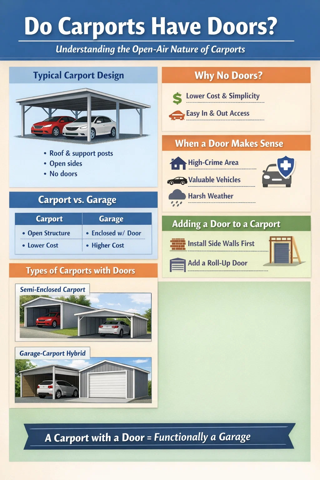 No, a standard carport does not have a door. Unlike a garage, a carport is an open or semi-open structure designed to shelter vehicles from rain, sun, and debris without enclosing them behind a door or wall. That said, some carport designs do incorporate side panels, privacy screens, or even retrofit door systems — so the answer depends heavily on the type of carport you choose or build.