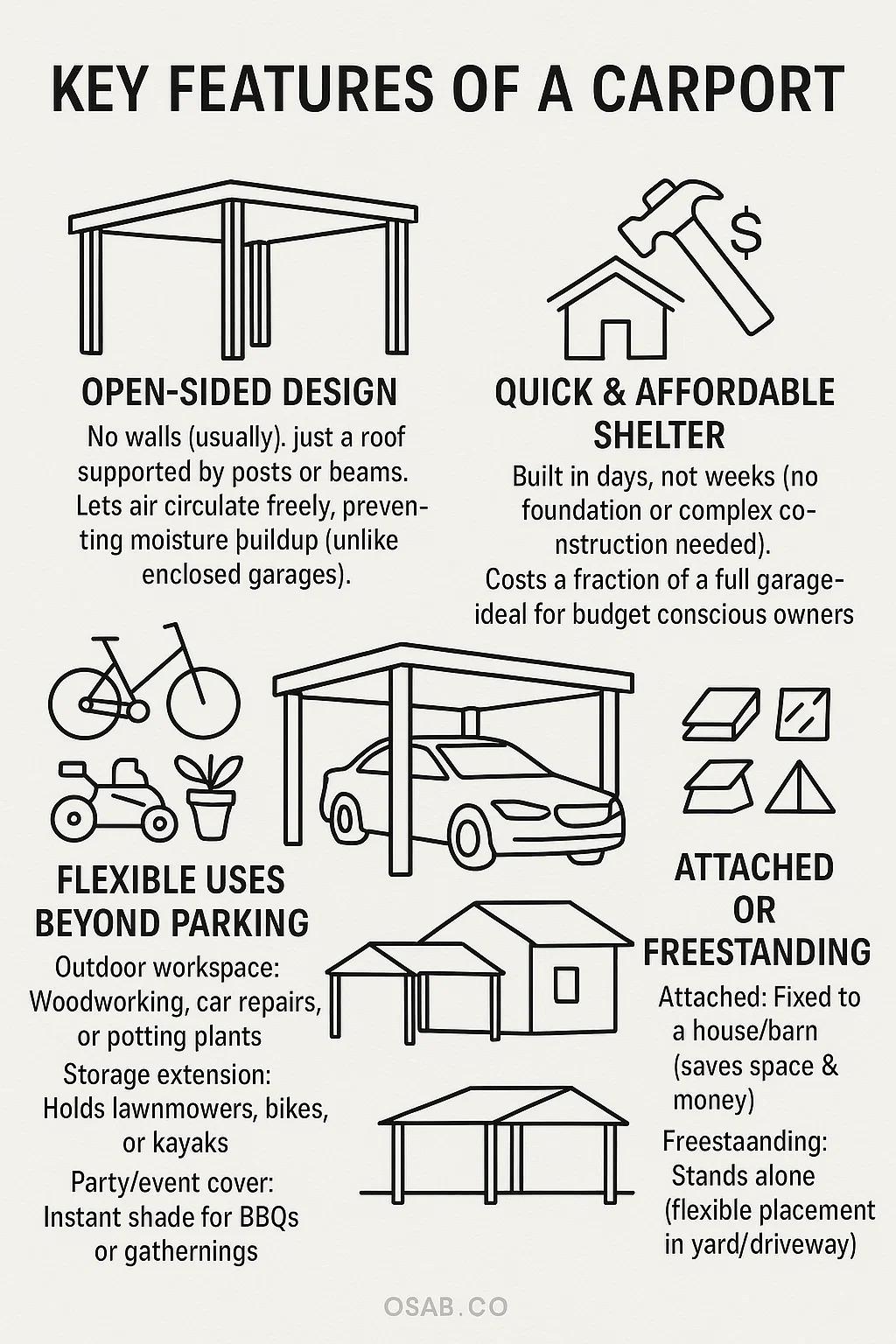 A carport is a simple, roofed structure designed to protect vehicles (cars, bikes, boats, etc.) from weather—without the walls and doors of a traditional garage. Think of it as a "half-garage" that prioritizes function over fancy finishes.