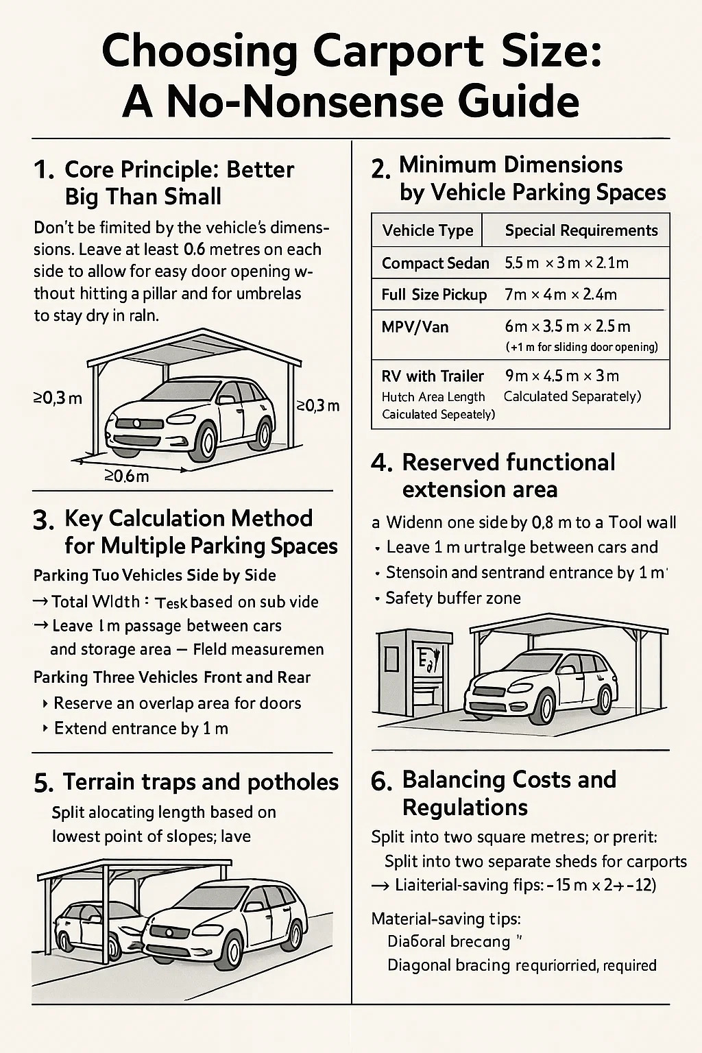 Don't be limited by the vehicle's dimensions: Leave at least 0.6 meters on each side to allow for easy door opening without hitting a pillar and for umbrellas to stay dry in the rain.
