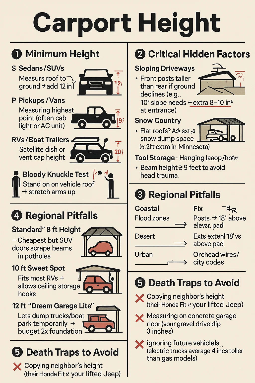 Sloping Driveways: → Front posts taller than rear if ground declines (e.g., 10° slope needs **extra 8-10 inches extra 8-10 inches at entrance). → Fail example: Truck bed clears entrance but scrap Truck bed clears entrance but scrapes rear beam when parked.