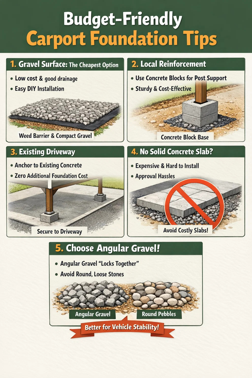 For most homeowners who want to save money and provide shelter for their cars, a gravel foundation is widely considered the cheapest and most cost-effective option.