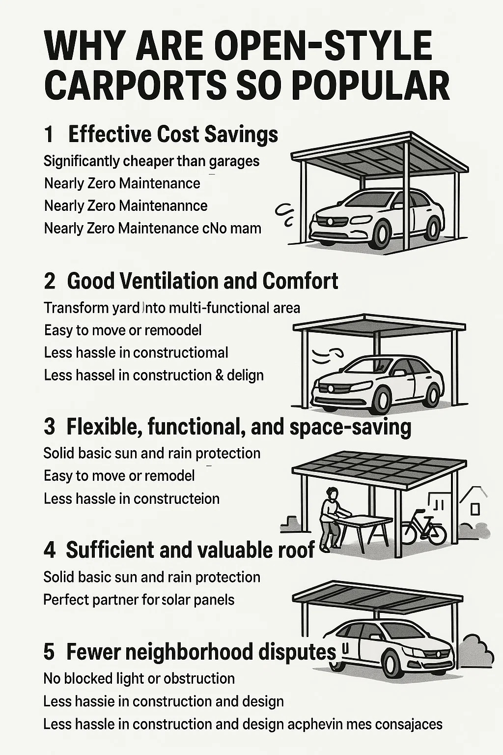 No blocked light or obstruction: The low, open carport doesn't affect neighbors' access to light, feels more spacious than a closed garage, and reduces potential issues with property management. Less hassle in construction and design: Many places have relaxed approval processes for small-sized open carports, saving you the trouble of running around to different departments to get stamps.
